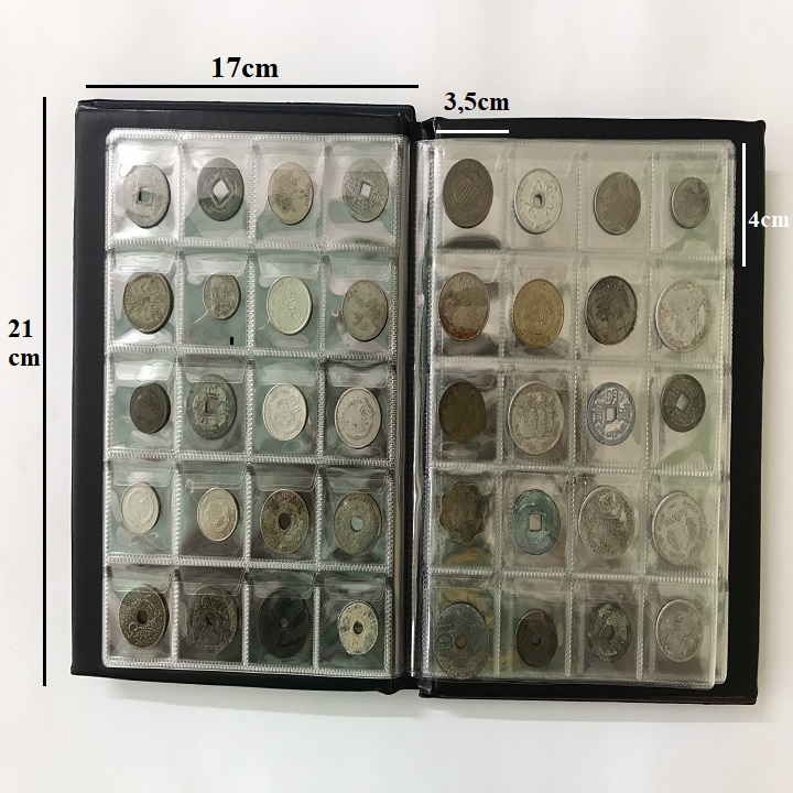 Kích thước của album 200 xu là: 21X17X1,5cm (Dài X Rộng X Cao). Kích thước ngăn đựng xu: gồm 200 ngăn với kích thước 4X3,5cm (Dài X Rộng).