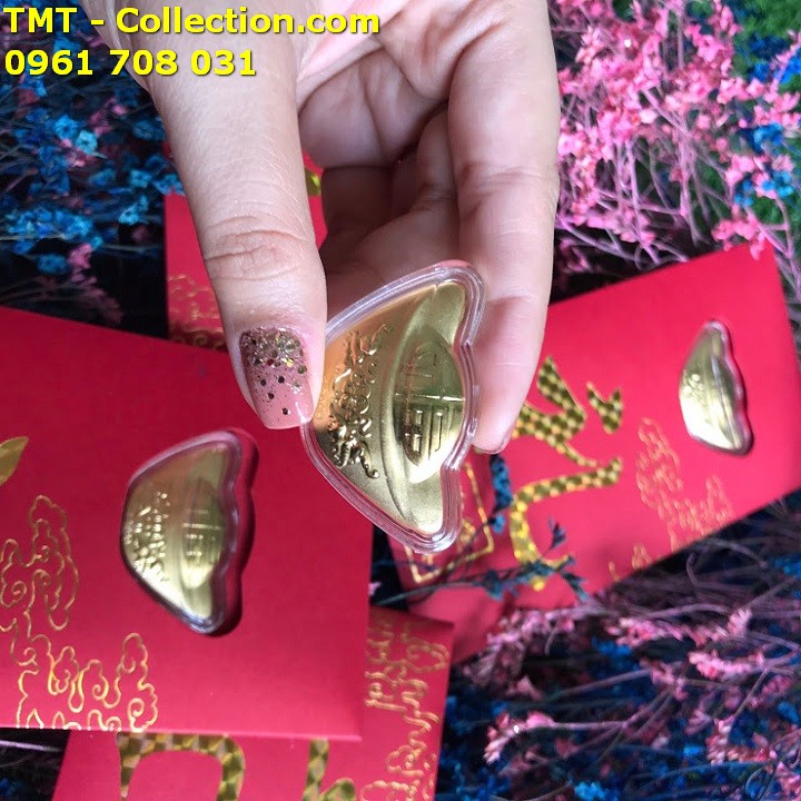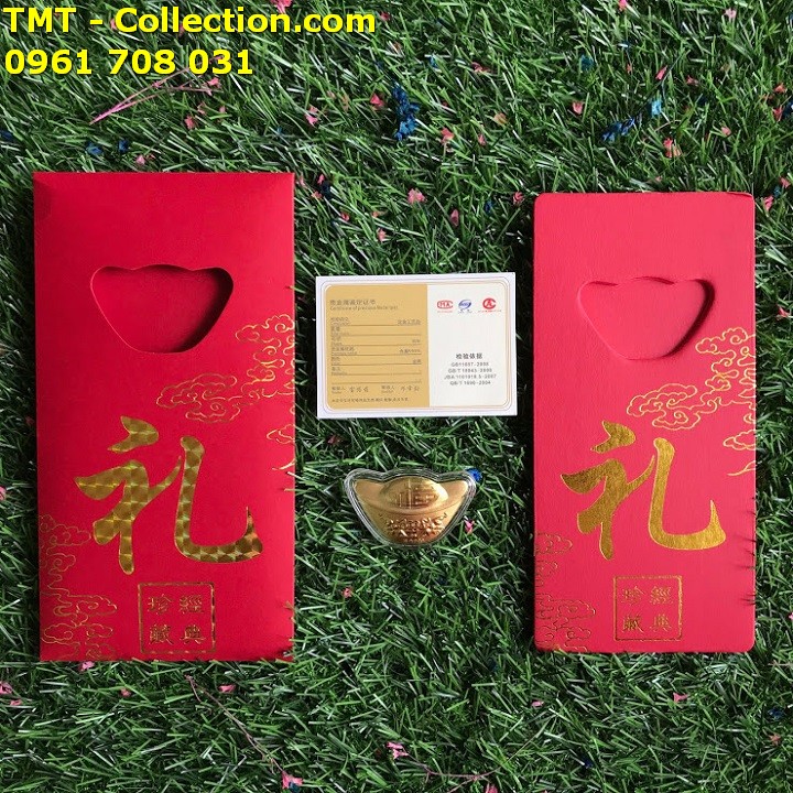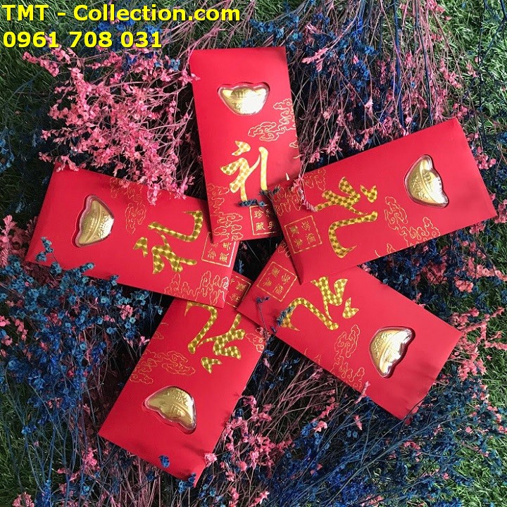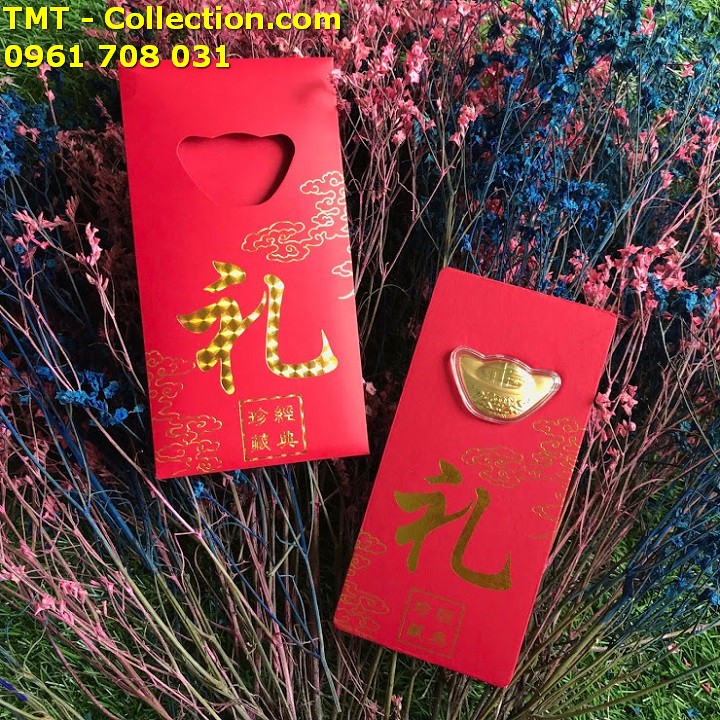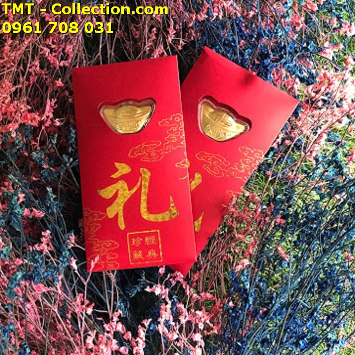 Đặc điểm nổi bật: Bao lì xì thỏi vàng gồm một bao lì xì đỏ đi kèm với một mặt thỏi vàng được khắc đầy tinh xảo, khóe léo. Thỏi vàng là tượng trưng của tài phú, giàu có, dư dả. Vì thế bao lì xì thỏi vàng sẽ mang đến sự sung túc và may mắn cho gia đình và trong công việc làm ăn. Bao lì xì cũng thích hợp để làm quà dành tặng người thân và bạn bè.
