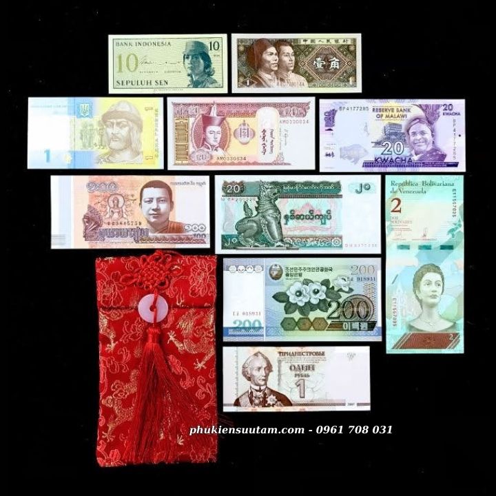 Mô tả sản phẩm: Sản phẩm gồm Malawi 20 Kwacha 2015 UNC, Indonesia 10 Sen 1964 UNC, Transnistria 1 Rubles 2007 UNC, Ukraine 1 Hryven 2011 UNC , Venezuela 2 Dos Bolivares 2018 UNC , Myanmar 20 Kyats 1996 UNC, North Korea - Triều Tiên 200 Won 2005 UNC, Cambodia - Campuchia 100 riels 2014 UNC, China - Trung Quốc 1 Jiao 1980 UNC,Mongolia - Mông Cổ 20 Tugrik 2011 UNC.