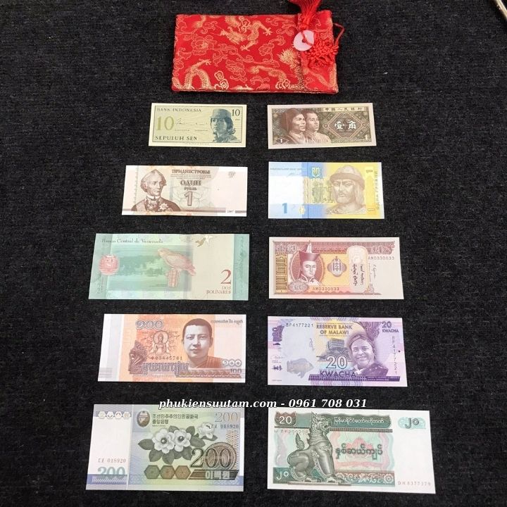 Đóng gói sản phẩm: 1 x Bộ 10 tờ tiền 10 quốc gia trên thế giới tặng túi gấm