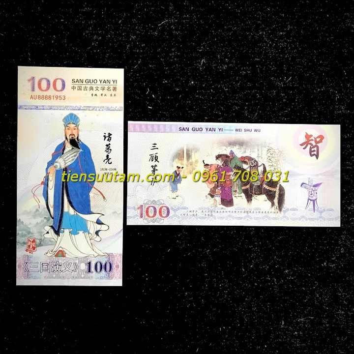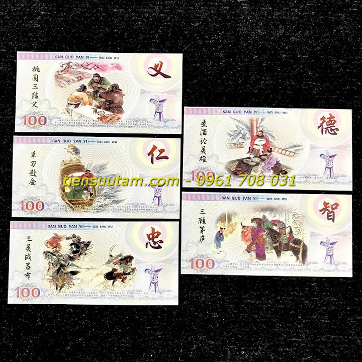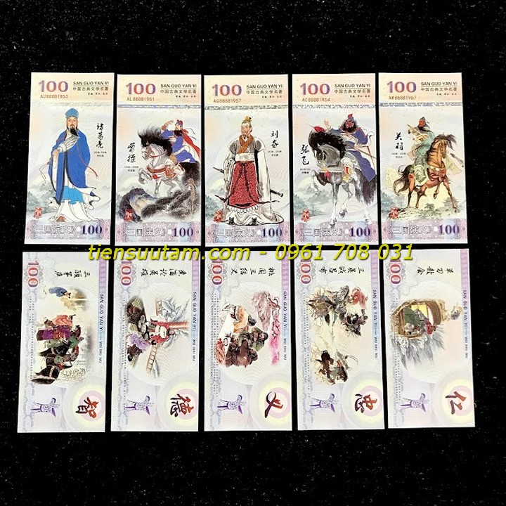 Mô tả sản phẩm: Bộ 5 Tờ Lưu Niệm Các Nhân Vật Trong Tam Quốc Chí có chất liệu giấy. Dựa theo Tiểu thuyết "Tam quốc diễn nghĩa" của La Quán Trung - một trong tứ đại danh tác của văn học Trung Quốc, được xây dựng dựa trên các sự kiện và nhân vật có thật trong lịch sử.