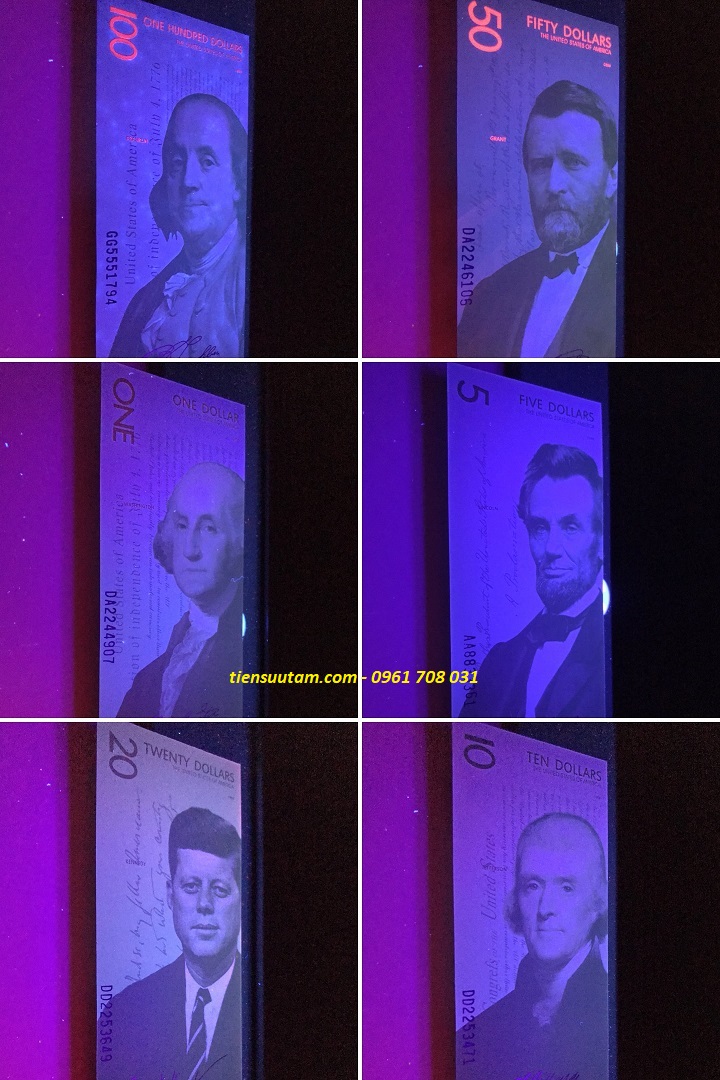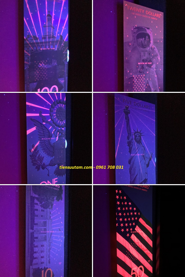 Hình dạ quang mặt trước của Bộ 6 Tờ Tiền Lưu Niệm Polyme Dạ Quang Của Mỹ