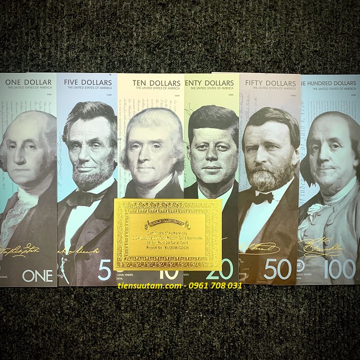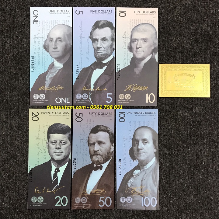 Mô tả sản phẩm: Bộ 6 Tờ Tiền Lưu Niệm Polyme Dạ Quang Của Mỹ là một bộ 6 tờ tiền gồm các mệnh giá 1 Dollar - 5 Dollars - 10 Dollars - 20 Dollars - 50 Dollar - 100 Dollar , chất liệu bằng polymer. Bộ tiền được thiết kế với mặt trước là hình 6 vị cựu tổng thống Mỹ: Abraham Lincoln, Thomas Jefferson, George Washington , John F. Kennedy, Ulysses S. Grant, Benjamin Franklin kèm với 1 tờ giấy chứng nhận mạ vàng plastics. Bộ tiền Lưu Niệm Polyme Dạ Quang Của Mỹ được phát hành nhằm mục đích sưu tầm , lưu niệm nên tiền không có giá trị sử dụng hay quy đổi dưới các thức khác.