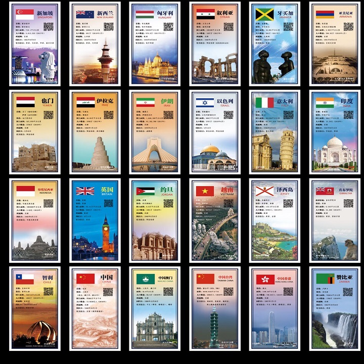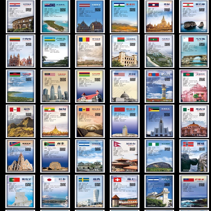 Mô tả sản phẩm: Bộ cờ 150 nước gắn vào phơi được làm từ giấy in cứng dày, láng bóng có 150 miếng tương ứng 150 lá cờ. Mỗi một tờ cờ đều có một mặt in hình màu bắt mắt. Mặt trước in 150 hình quốc kỳ của các quốc gia thuộc 5 Châu. Sau đó là các phần thông tin về vị trí địa lý, thủ đô, dân số, đơn vị tiền tệ, GDP, ngày quốc khánh BẰNG TIẾNG TRUNG. Đồng thời in hình một kiến trúc tiêu biểu của quốc gia đó. Mặt sau tờ cờ là trắng để bạn có thể ghi chú thêm vào đó.