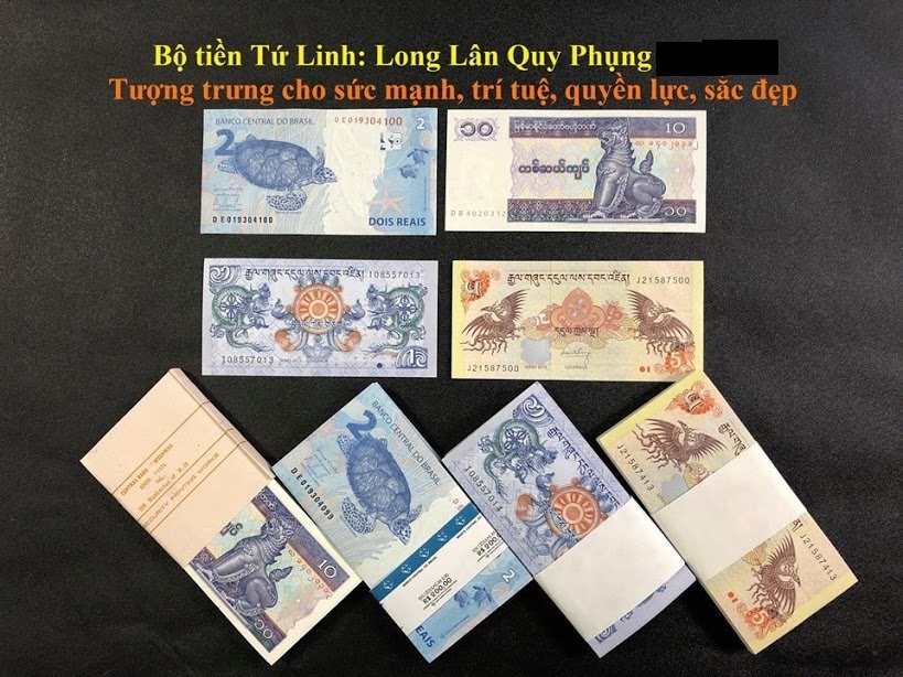 - Bộ tiền tứ linh chúc tết LONG LÂN QUY PHỤNG gồm 4 tờ tiền của 3 quốc gia, trong đó :