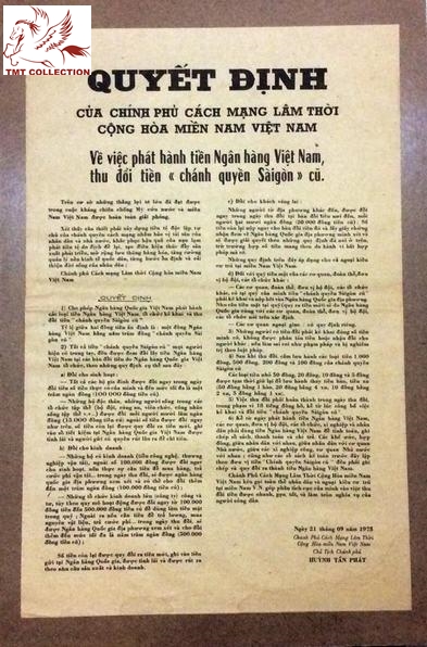 Sau đó, ngày 14.6.1975 có thêm Nghị định số 6.NĐ.75 giao cho NHQGVN nhiệm vụ tổ chức việc thanh lý tài sản của các ngân hàng và tổ chức tín dụng tư nhân nhằm bảo vệ tài sản của nhà nước và nhân dân. Tình hình chung dần dần đi vào ổn định nên ngày 1.8.1975, Trung ương Cục ra thông tri số 18.TT.75 chuyển các Ủy ban Quân quản thành Ủy ban Nhân dân Cách mạng ở các tỉnh thành phố để đi vào quản lý bình thường. Và đến ngày 21.9.1975 CPCMLTCHMNVN ra Quyết định số 12.QĐ cho phép NHQGVN phát hành các loại tiền "Ngân hàng Việt Nam" đã in từ 10 năm trước, đồng thời tổ chức kê khai và thu đổi tiền của Chính phủ Saigon cũ: từ Đà Nẵng vào Nam cứ 1 đồng tiền cách mạng thu đổi 500đ tiền Saigon cũ...