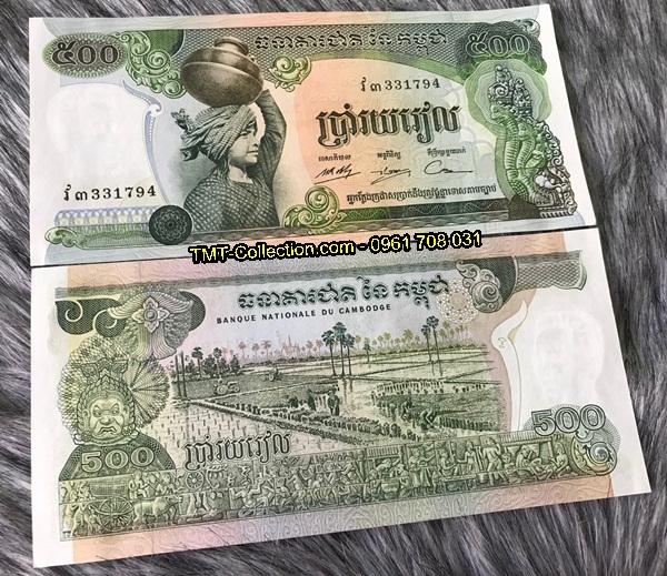 Mặt Sau: Hình ảnh các nông dân ở ruộng lúa nước và các biểu tượng của người Khmer cổ đại