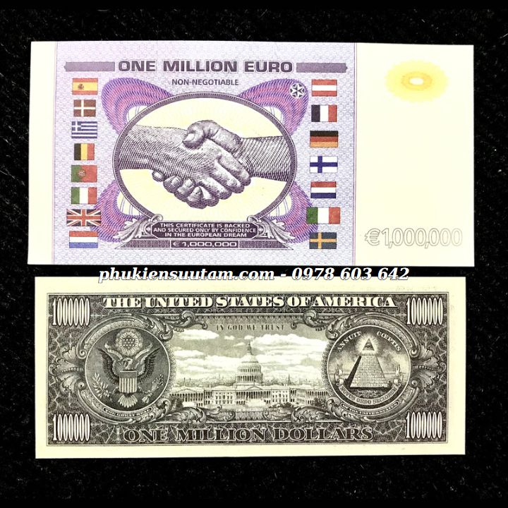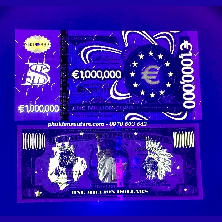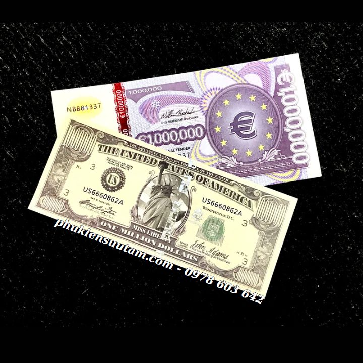 Mô tả sản phẩm:Mặt trước tờ 1 Triệu USD là hình nữ thần tự do có chạy chỉ bảo an biến đổi quang học dọc tờ tiền. Tờ 1 triệu Euro có mặt trước là hình hoa văn uốn lượn màu tím vàng đỏ cùng kí hiệu tiền tệ quốc tế, chạy chỉ bảo an biến đổi quang học dọc tờ tiền.