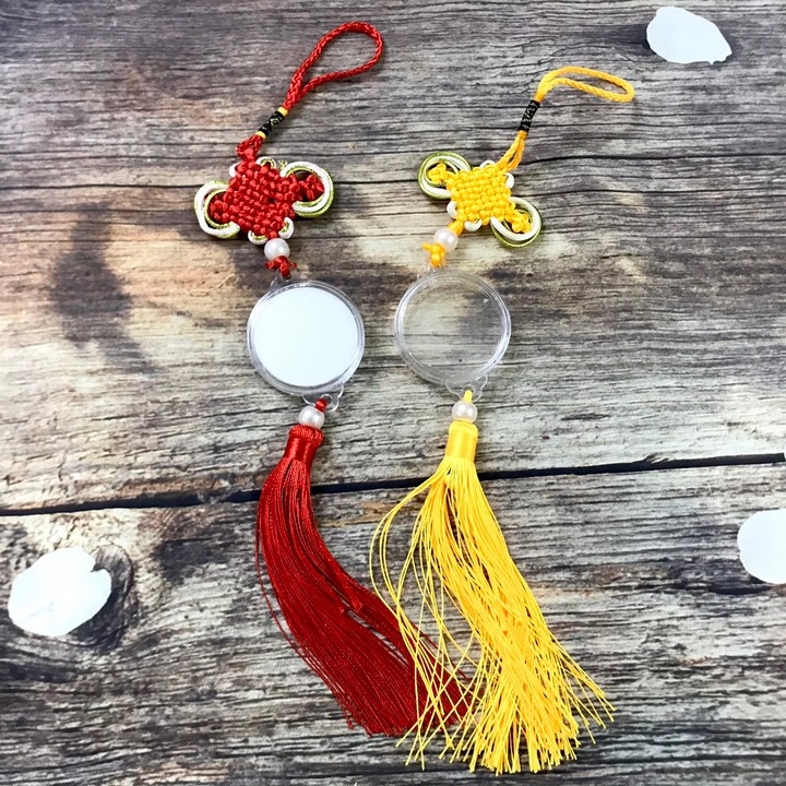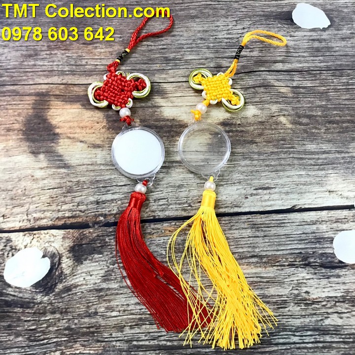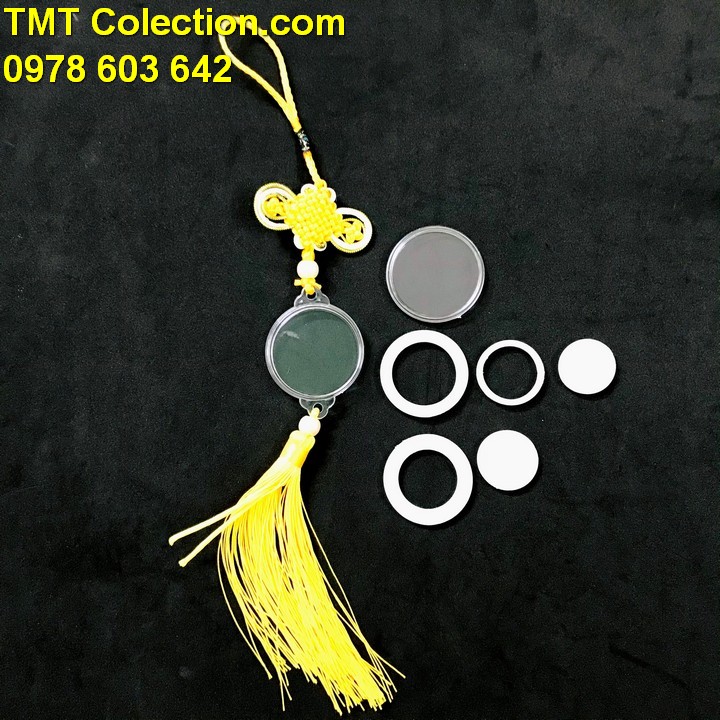 Mô tả sản phẩm: Dây treo đồng xu may mắn là một sợi dây thừng màu đỏ hoặc vàng được kết nút như ý, ở giữa sợi dây treo một hộp nhựa arylic trong suốt, bên trong có 2 miếng cao su tròn màu trắng được chia thành từng vòng nhỏ dần để cố định những đồng xu kích thước khác nhau trong hộp nhựa.