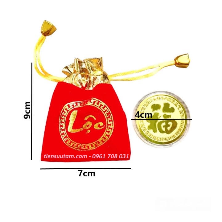 Kích thước: kích thước của túi gấm là 9x7cm (Dài x Rộng). Đường kính của đồng xu là 4cm.