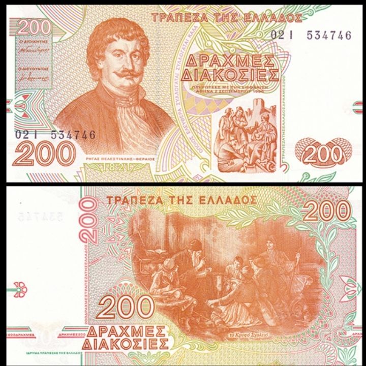 Mặt trước: Màu cam trên nền in nhiều màu. Rigas Velestinlis-Feraios (tên khai sinh là Antonios Rigas Velestinlis); người chơi và ca hát; câu nói "Người suy nghĩ thoải mái, suy nghĩ tốt."