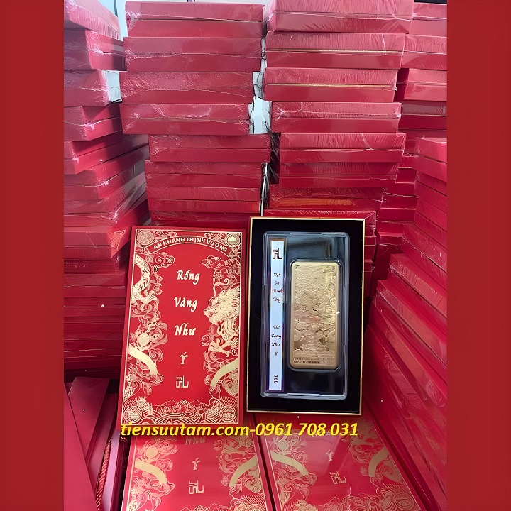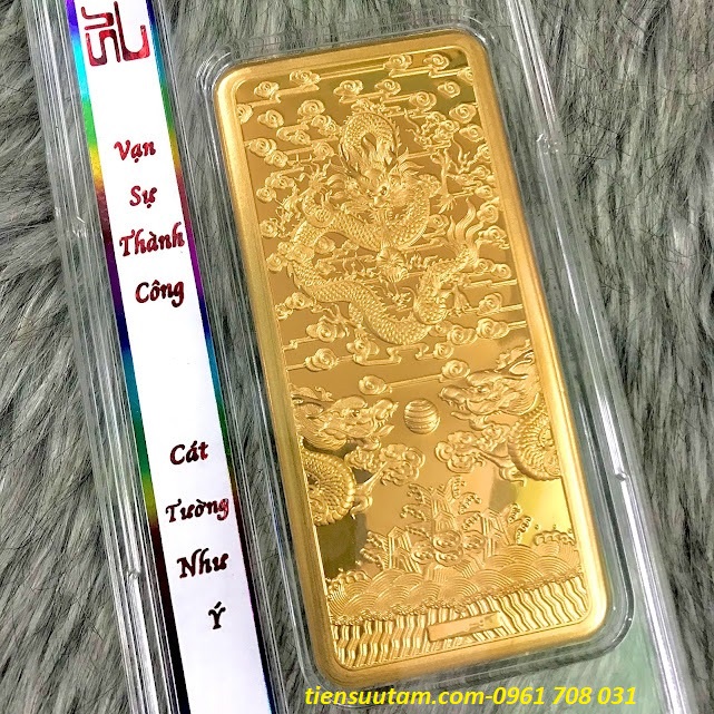 Đặc điểm nổi bật: Hộp ngoài được làm từ bìa cứng màu đỏ cứng cáp có nhũ kim tuyến lấp lánh rất bắt mắt và được in hình Rồng, vàng uốn lượn. Thỏi vàng bên trong được chạm trổ hình rồng rất tinh xảo làm tăng thêm vẻ đẹp sang trọng, cao cấp.