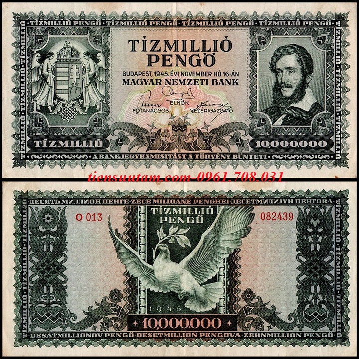 Mặt trước: Chữ: NGÂN HÀNG TÍZMILLIÓ PENGŐMAGYAR NEMZETI Dịch: Mười triệu Pengoes Ngân hàng Quốc gia Hungary
