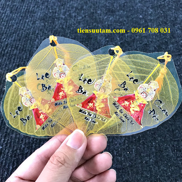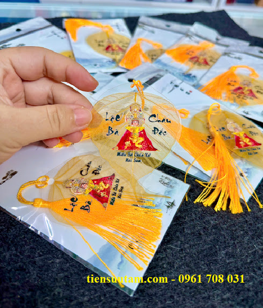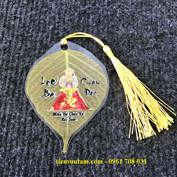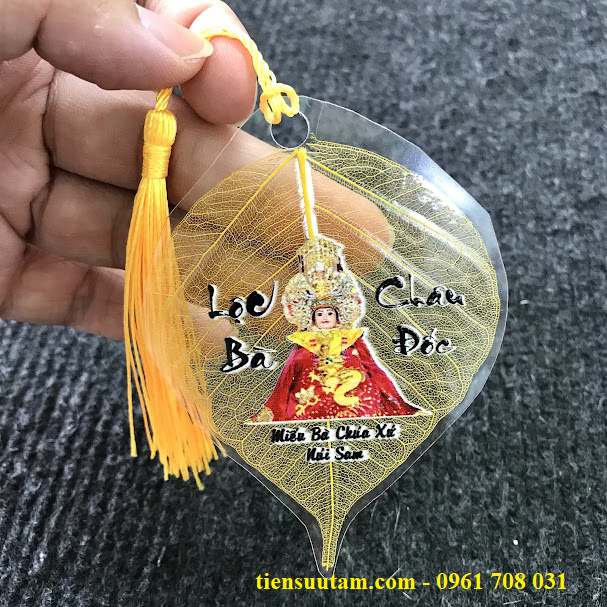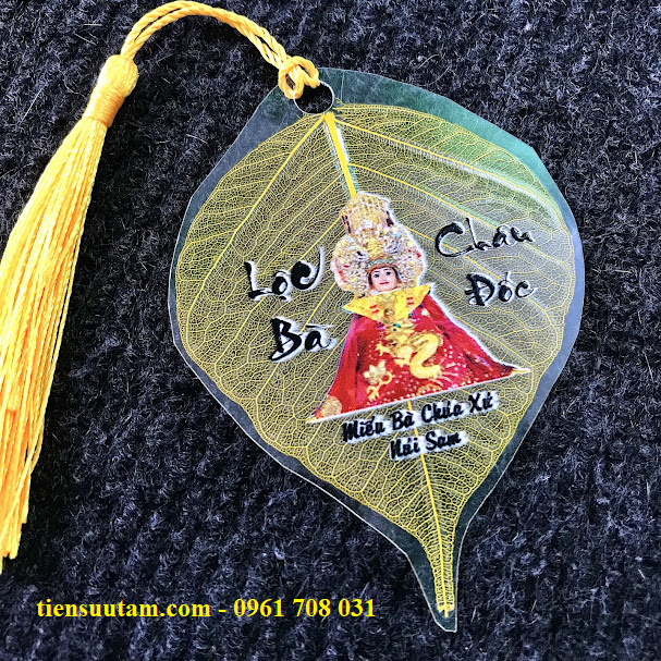 - Hình ảnh Bà Chúa Xứ được in sắc nét, sống động trên nền lá bồ đề mỏng nhẹ, tinh tế
