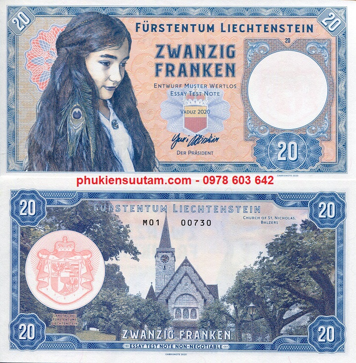 Tiền Liechtenstein 20 Franken 2020 UNC Test Note Specimen