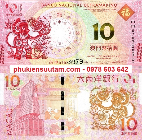 Tiền Macao 10 Patacas 2016 UNC Ultramarino Bank Kỷ Niệm Năm Khỉ (tờ)