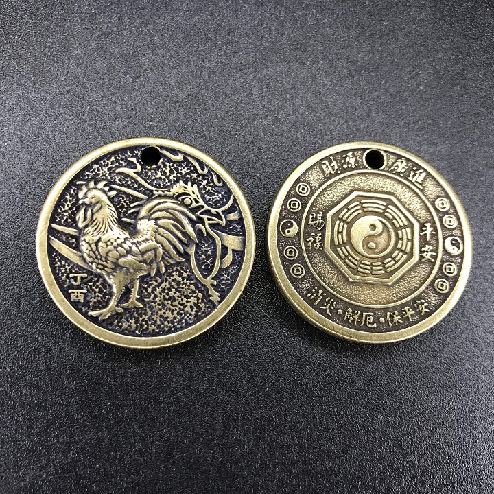 Mô tả sản phẩm: Mặt Đồng Xu Đồng Hình Con Gà là một mặt đồng xu bằng đồng, với mặt trước là hình con gà, mặt sau là hình bát quái cùng các chữ tiếng Trung. Trên đồng xu cũng đã được khoét một lỗ nhỏ để có thể xỏ móc khóa vào hoặc luồn dây để đeo.