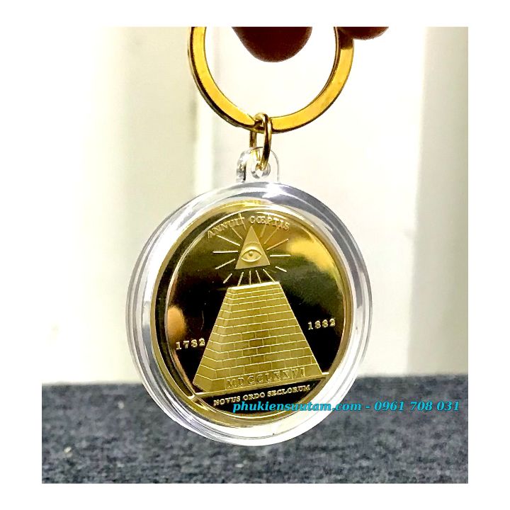 Mô tả sản phẩm: Sản phẩm gồm móc khóa là hộp nhựa trong suốt đựng đồng xu Hình Kim Tử Tháp Con Mắt Đại Bàng Của Mỹ.Mặt trước đồng xu là hình một kim tự tháp với phần chóp và phần thân bị tách rời nhau, trên đỉnh của kim tự tháp là một con mắt thần quan, thường được xem là biểu tượng của tam Điểm thần bí. Mặt sau đồng xu khắc hình quốc huy của Hoa Kì