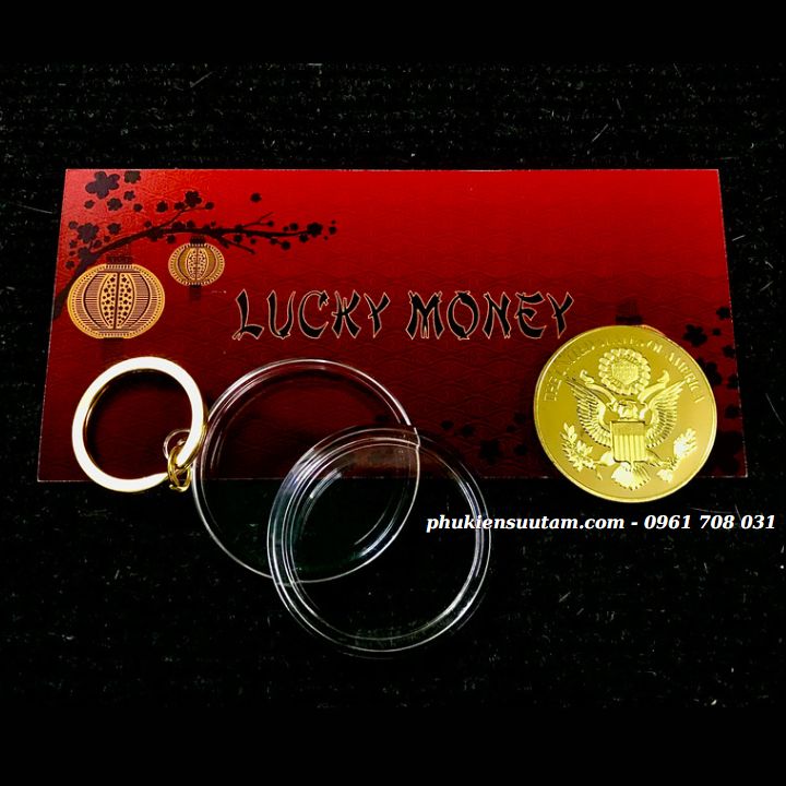 Kích thước: Đường kính đồng xu là 4 cm. Hộp tròn móc khóa có đường kích 4,1 cm