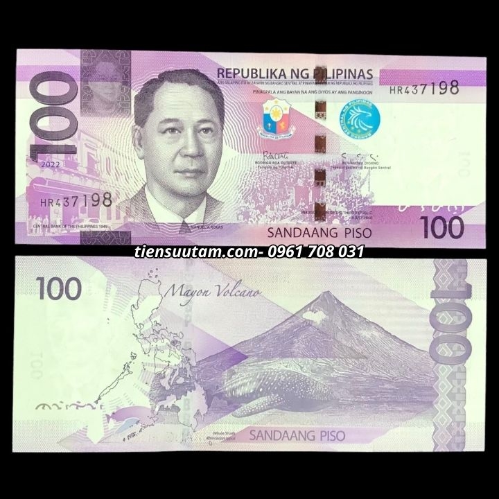 Mặt Sau: Núi lửa Mayon ở hậu cảnh, cá mập voi (Rhincodon typus) ở giữa, bản đồ phác thảo Philippines ở bên trái, hình thêu truyền thống từ vùng Bicol ở bên phải.