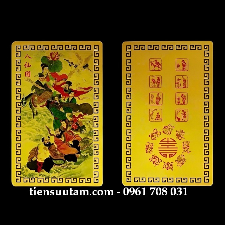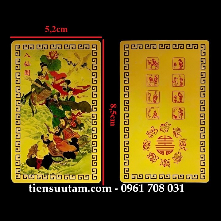 Công dụng: Thẻ Kim Bài Bát Tiên Vượt Biển Đạo Giáo Dùng để trong ốp lưng điện thoại, để nơi làm việc, trong xe hơi, bàn thờ ông địa,... có thể dùng làm quà tặng cho bạn bè người thân, là món quà mang nhiều ý nghĩa