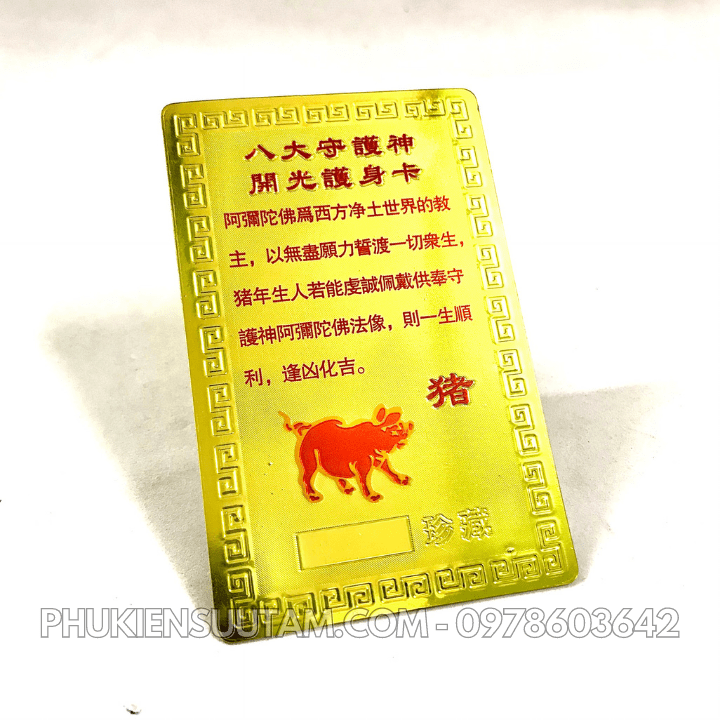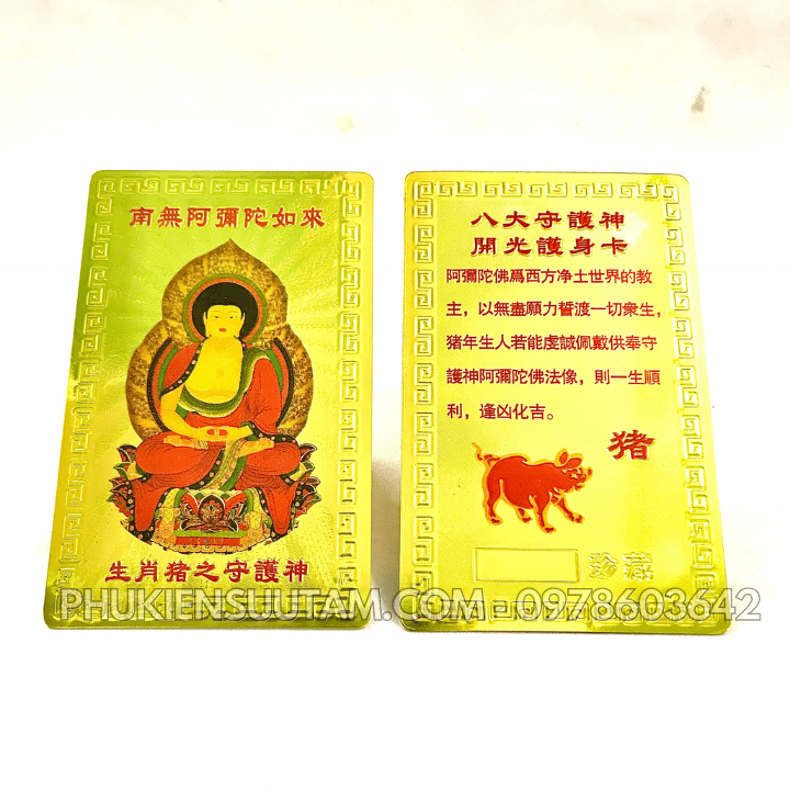 -Mô tả sản phẩm: Thẻ Kim Bài Phật Bản Mệnh Tuổi Hợi – Đức Phật A Di Đà được làm tấm nhựa plastic mạ nhũ vàng. Thẻ Kim Bài Phật Bản Mệnh Tuổi Hợi – Đức Phật A Di Đà gồm mặt trước được in màu hình Phật A Di Đà sắc nét, phía trên có hàng chữ tiếng Trung " Nam Mô A Di Đà Như Lai " , phía dưới là dòng chữ Trung " Thần hộ mệnh của loài Heo hoàng đạo ". Mặt sau được in chữ đỏ với ý nghĩa của tấm kim bài bản mệnh cho người tuổi Hợi, cùng với hình ảnh chú Heo ( biểu tượng cho người tuổi Hợi). Xung quanh tấm kim bài được chạm khắc hoa văn tinh xảo .