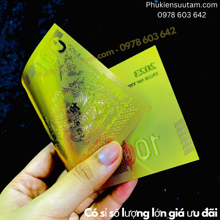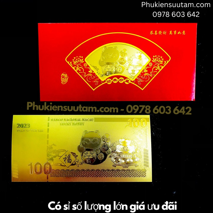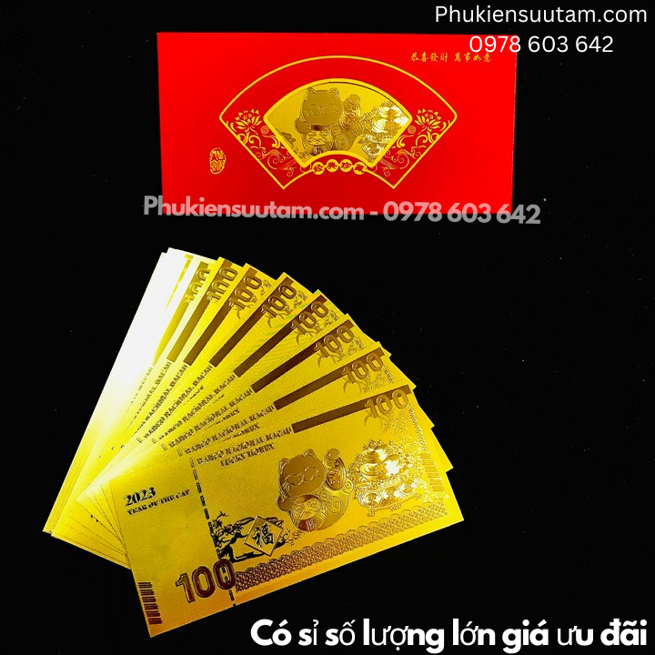 Mô tả sản phẩm: Thiệp lì xì con Mèo Thần Tài mạ vàng plastic gồm 1 thiệp lì xì đỏ may mắn bên ngoài và một tờ tiền lưu niệm chất liệu bằng plastic ở bên trong.Tờ tiền bên trong là một tờ nhựa plastic mạ một lớp màu vàng óng ánh, mặt trước và mặt sau tờ tiền là hình chú Mèo Thần Tài rất đáng yêu. Lư đựng tiền vàng, chữ số ''100" và số "2023".
