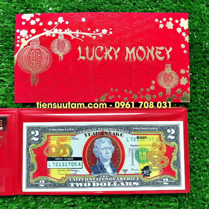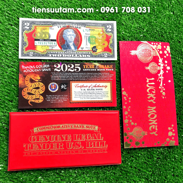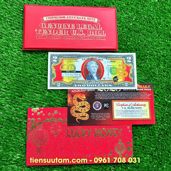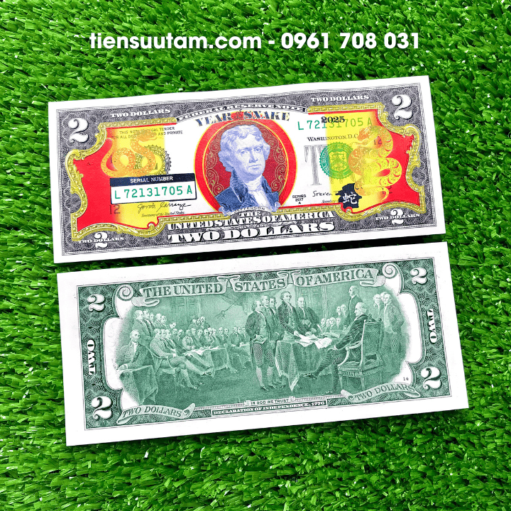 Hình ảnh rắn mạ vàng: Hai chú rắn được mạ vàng trên nền tờ tiền 2 USD, làm nổi bật sự tinh tế và giá trị phong thủy của sản phẩm, mang lại may mắn và thịnh vượng cho người sử dụng.