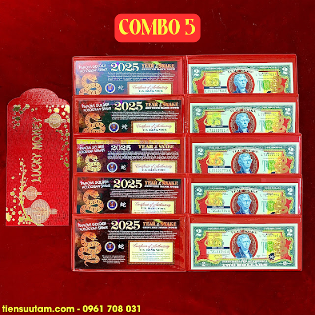 Chất liệu: Sản phẩm là tờ tiền 2 USD thật 100%, được in hình hai chú rắn uy nghi bằng lớp keo vàng phản quang. Chất liệu giấy cotton cao cấp kết hợp với mực in phản quang tạo nên sự độc đáo và sang trọng cho tờ tiền.