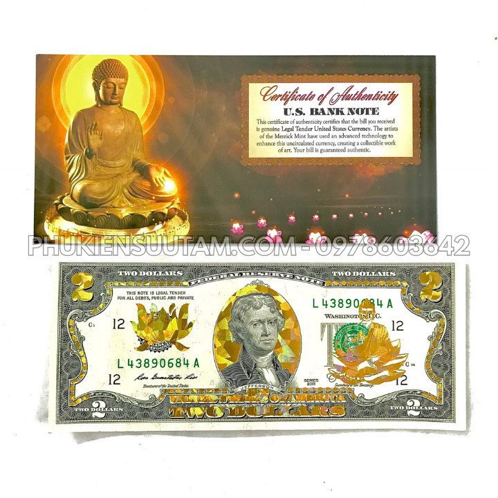 Tiền 2 USD in hình Đức Phật nhũ vàng.Phukiensuutam.com