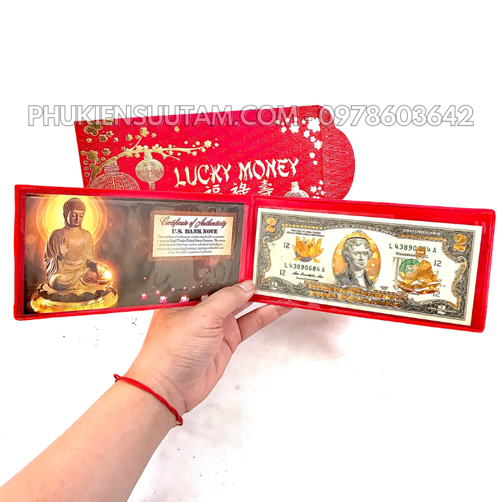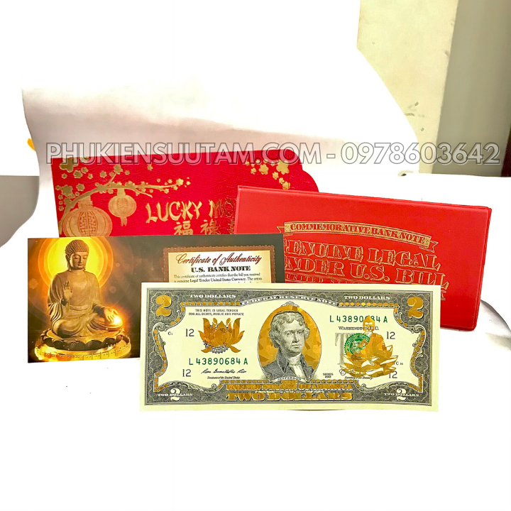 Đặc điểm nổi bật: Tiền 2 USD seri 2017 là tiền thật 100% nhưng được in hình Đức Phật nhũ vàng nên tiền chỉ còn giá trị lưu niệm., như một lời chúc ý nghĩa tiền tài sung túc, may mắn, sức khỏe đến với người sở hữu. Tờ Tiền 2 USD in hình Đức Phật nhũ vàng cũng sẽ là món quà cực kì phù hợp dành tặng cho cấp trên, gia đình, bạn bè...