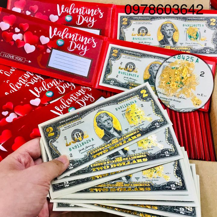 Đặc điểm nổi bật: Tiền 2 USD Valentine Mạ Vàng 3D là tờ tiền 2 USD thật 100% có hình bó hoa hoặc hình bông hoa hồng được in bằng lớp keo vàng phản quang. Tờ tiền với chất liệu là tiền USD thật, in hình màu độc đáo, như một lời chúc ý nghĩa trong dịp Lễ 14/2 - Valentine's Day. Tờ Tiền 2 USD Valentine Mạ Vàng 3D sẽ là món quà ý nghĩa phù hợp dành tặng cho nửa kia của bạn.