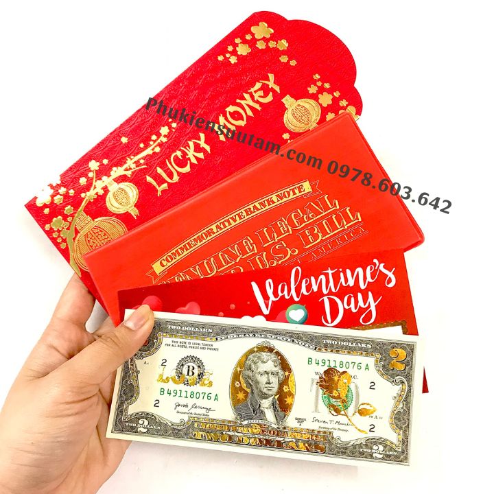 Đóng gói Sản Phẩm: 1x Tiền 2 USD Valentine Mạ Vàng 3D; x1 Giấy Chứng Nhận; x1 Bao Da Đỏ Cao Cấp; x1 Thiệp Lucky Money.