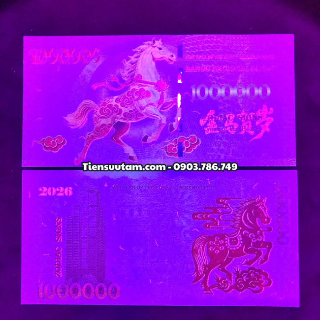 Chất liệu: Giấy phản quang 3D cao cấp, khi soi dưới đèn UV sẽ hiện rõ hoa văn ngựa vàng và số mệnh giá phản sáng cực đẹp.