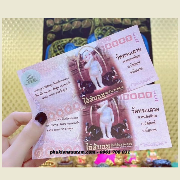 Đặc Điểm Nổi Bật: Tiền Lưu Niệm 10.000 Baht Hình Luang Phor Songk chùa Wat Song Sawoey Thái Lan có chất liệu giấy. Mặt trước tờ tiền là hình của nhà sư Luang Phor Songk (30/4/1890 - 2/8/1983), một bậc chân tu rất được ca tụng bởi đức độ và tài năng, được cho là có thể thực hiện những phù chú giúp đỡ cho những người thành tâm cầu khẩn. Mặt sau là hình búp bê em bé để cầu nguyện, rất linh thiêng trong tín ngưỡng người Thái. Nên tờ tiền rất phù hợp để trong túi, sau ốp lưng điện thoại, bàn làm việc...để cầu mong được nhiều may mắn, tránh tai ương. Tiền cũng rất thích hợp làm quà tặng cho người thân, bạn bè.
