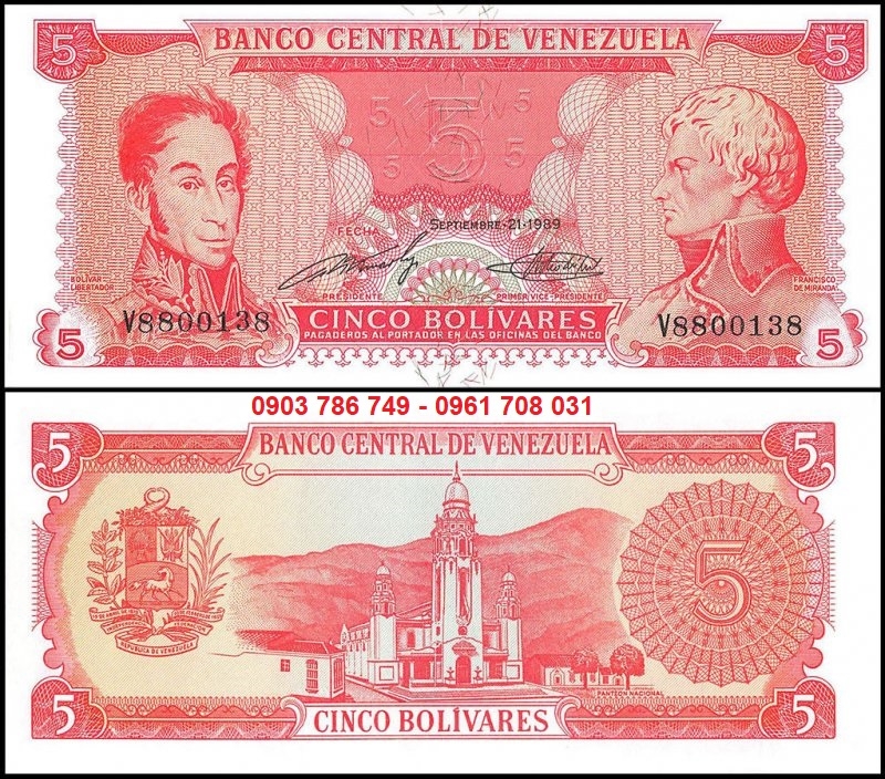 Tờ tiền sưu tầm Venezuela 5 Bolivares 1989 UNC được phát hành bởi Ngân hàng Trung ương Venezuela năm 1989. Mặt trước của tờ tiền in chân dung Simón Bolívar và Francisco de Miranda – hai nhân vật lịch sử quan trọng trong cuộc chiến giành độc lập của Venezuela và Nam Mỹ.