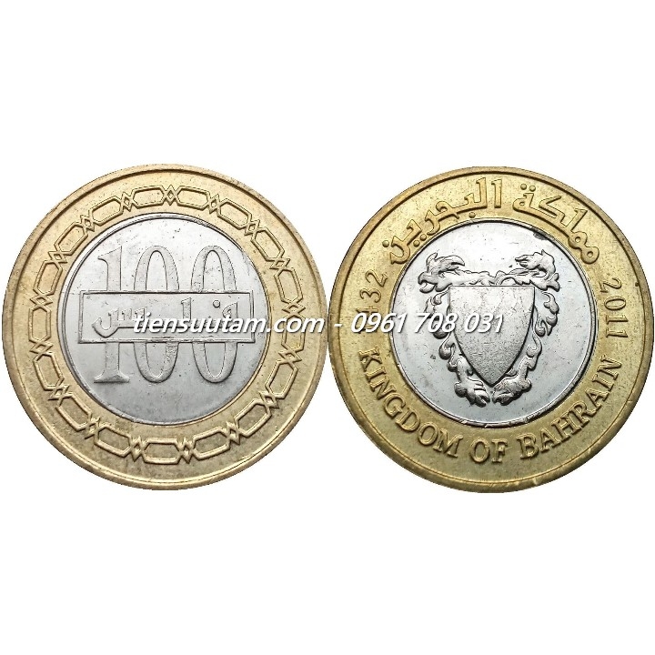 Mặt sau: Xu Bahrain 100 Fils 2009-2018 Quốc huy của Vương quốc Bahrain và tên quốc gia bằng tiếng Ả Rập và tiếng Anh cùng với ngày Hijri (Hồi giáo) và lịch Gregorian bằng tiếng Anh.