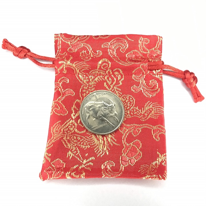 Đóng gói Sản Phẩm: 1x Xu con Trâu 1 piso của Philippines, 1 x túi gấm.