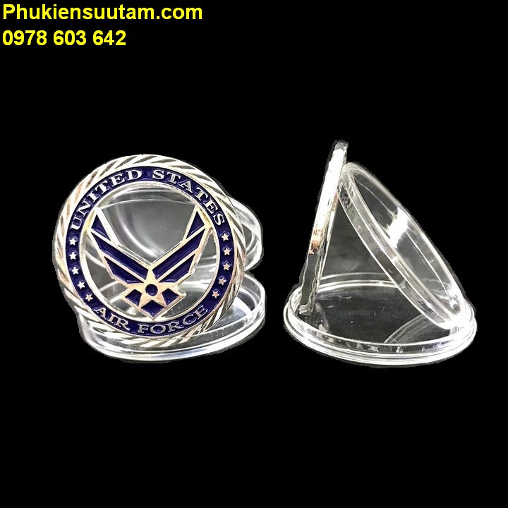 Chất Liệu: Xu Huy Hiệu Không Quân Hoa Kỳ được đúc từ Niken phủ một lớp sơn màu xanh và được bảo quản bằng hộp nhựa tránh trầy xước.
