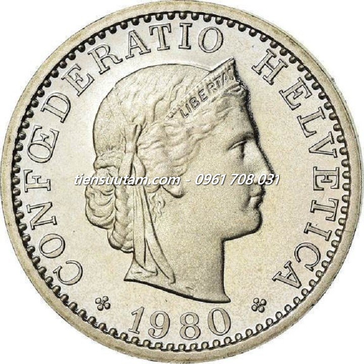 Mặt trước: Xu Switzerland - Thụy Sĩ 20 Rappen 1939-2024 khắc hình ảnh Đầu của Libertas (nữ thần tự do của La Mã) quay mặt về bên phải, tóc tết bện bằng ruy băng và đội vương miện.