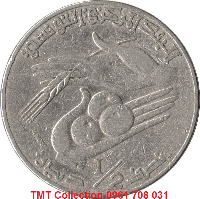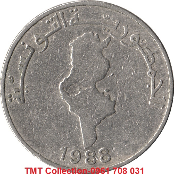 Mặt trước: Bản đồ đất nước Tunisia in nổi. Phía dưới là năm phát hàng đồng tiền.