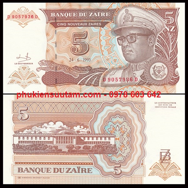 Mặt trước: Có chữ Banque du Zaïre - cinq nouveaux Zaïre, Nhà độc tài Zairean - Mobutu Sese Seko trong quân phục.